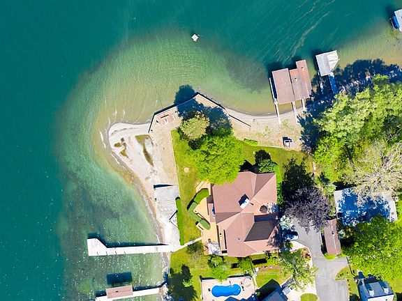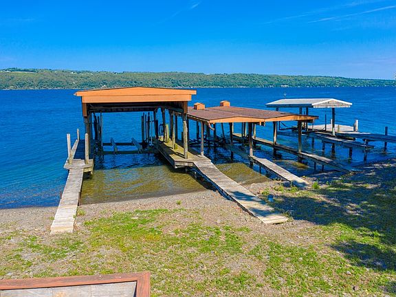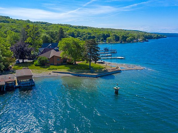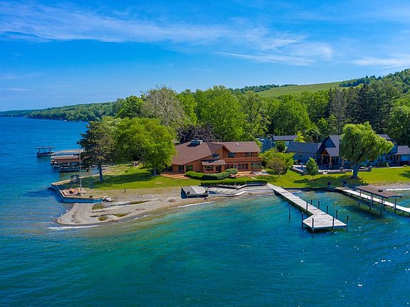 Sitting on the point at Peach Orchard is an awesome one of a kind contemporary home offering over 5400 sq ft of living space and 375 ft of level lake frontage. This spectacular property has lake views from every room. Spacious great room with sunken LR, massive WB fireplace, elevated den and dining. Additional lake view dining in sunroom off kitchen. Multiple decks, docks and screened in porch. Wake up in master suite with a wall of windows facing Seneca Lake. Other exclusive features include 3 boat lifts, newer seawall, generator, walk in pantry, attached greenhouse, oversized garage and more
