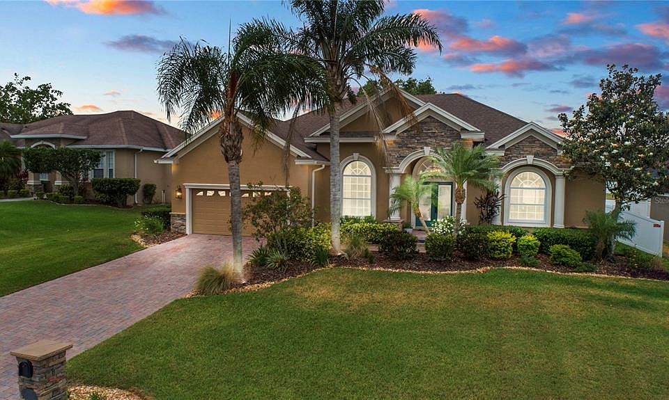 Nestled within a private gated community in South Lakeland, this stunning home exudes elegance and sophistication. Boasting exquisite craftsmanship and attention to detail, this home is a true masterpiece. As soon as you arrive you will notice the paver driveway and walk way, gutters on the entire home and landscape lighting including soffit lighting to add extra ambiance. From the moment you step through the front door, you will be entranced by the grandeur of the soaring ceilings, the additional trim and woodwork, the rich hardwood flooring, and the abundance of natural light that floods the home. The home features flexibility with a formal sitting room, a formal dining room, a breakfast nook and a large great room. The gourmet kitchen overlooks the great room and is a chef's dream, featuring top-of-the-line Frigidaire Gallery appliances, custom color cabinetry, granite countertops and a spacious breakfast bar perfect for entertaining guests. Enjoy the built in wine fridge and extra cabinets, a perfect spot for a coffee/wine bar. The open floor plan seamlessly flows from the kitchen to the great room inviting you to relax and unwind. The luxurious master suite is a serene oasis, complete with a spa-like bathroom, 2 walk-in closets, and sliding doors out to the patio. The bathroom features split vanities, a private water closet, a soaking tub and a walk in shower. The home features a triple split plan with 2 bedrooms and one bathroom together and the 4th bedroom and 3rd bathroom set apart. The third bathroom has an access door to the back yard. Outside, the large backyerd with newly installed (2022) privacy fence provides the perfect setting for entertaining. With the septic being in the front yard, installing your own pool would be no issue. The exterior was repainted in March of 2023. The AC system was replaced in 2017. The garage has extra heavy duty storage racks that will remain for the buyers convenience. This home could be sold furnished as all furnishings are negotiable. This private gated community provides security and the location gives access to some of the best schools, shopping, and dining in the area. Don't miss the opportunity to make this luxurious home your own and schedule your private showing today!!!