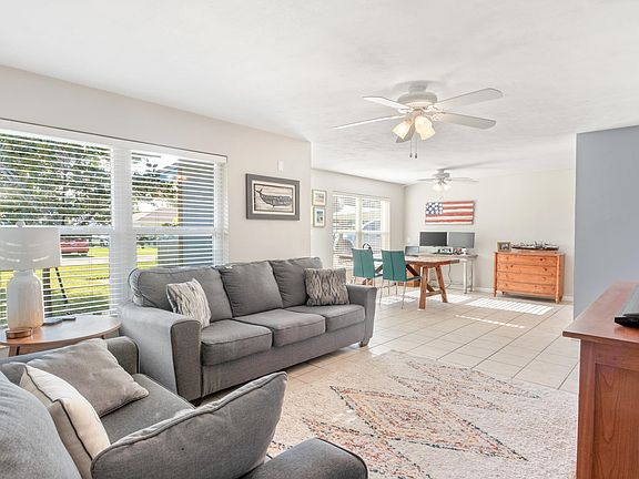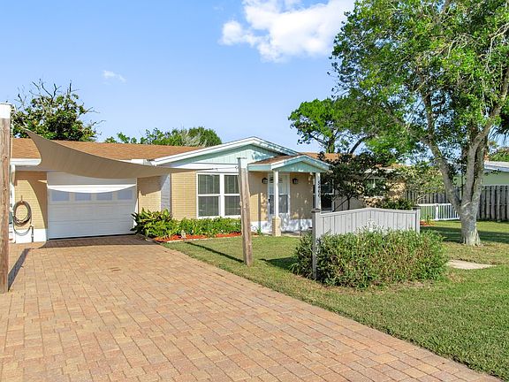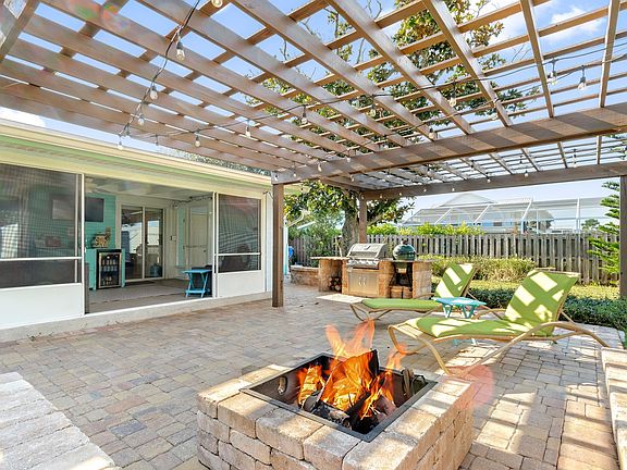 Welcome to this charming beachside bungalow offering a relaxed and inviting atmosphere that perfectly complements its quiet seaside location. Situated on a larger island lot away from the hustle and bustle, this updated retreat is a short stroll to the beach, nearby boat ramp, and parks! You're welcomed by an extended paver drive and a manicured yard is the entry to the home. Upon entry, the open and airy living area is illuminated with natural light, creating a warm and welcoming ambiance. The cozy living room is ideal for hosting gatherings with friends and family, while the adjacent dining area is perfect for enjoying delicious meals together. The heart of this home is the bright and cheery kitchen, featuring updated stunning quartz countertops that not only provide ample workspace but also enhance the overall aesthetic along with the white cabinets set against a beautiful glass tile backsplash. Whether you're a seasoned chef or just enjoy preparing casual beachside snacks, this kitchen has it all. Stainless steel appliances and ample cabinet storage make meal preparation a breeze. The two well-appointed bedrooms are perfect for unwinding after a day of beachcombing or soaking up the sun. The master bedroom has a beautiful accent wall with tile shiplap and shutters accentuating the window. A walk-in closet and en suite bathroom complete this retreat. The guest bedroom can be found down the hall with sliders that offer private access to the lanai for friends and family. Not to be missed is the screened lanai, where you can enjoy your morning coffee or evening cocktails while taking in the soothing nearby ocean breeze. Step outside onto the charming pergola, where a fire pit and grill stand await. This outdoor space is an entertainer's dream, perfect for barbecues and gatherings under the stars with plenty of green space for the family pup to run. This bungalow's location is unbeatable. Just a few blocks from the beach, you can easily access the sandy shores and gentle waves whenever the mood strikes. Embrace the coastal lifestyle with long walks on the beach, sunsets that paint the sky with breathtaking colors, and the soothing rhythm of the tides. A one car garage is just enough space to store all your beach toys along with plumbing for a potential extra bathroom. Don’t miss the oversized paver drive for multiple vehicles, the two storage sheds anchored in the fenced backyard and the outdoor shower! Short term rentals are permitted with attached pro forma upon request. Enjoy the beach life!