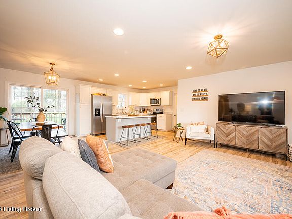 The kitchen features white cabinets w/ gold hardware, the island features Grey Cabinets. All stainless appliances will remain...Lot's of recessed lighting & windows create such a bright & airy atmosphere...NICE LVT flooring is thru the entire home including the finished bsmt. The open dining room features room for a large table & sliding doors to the nice size deck. Primary bedroom will accommodate a king size bed. Primary attached bath has tiled tub/shower unit & closet organizer that will remain. Hall bath features subway tiled tub/shower unit. Both bath's have pretty counter height vanities. You will be ''WOWED'' when you see the b Basement features 9 ft smooth ceilings, pretty decorative columns & LVT Flooring. The all open floor plan is great for entertaining. Basement has been waterproofed by Case Foundation w/ a Lifetime Transferable Warranty. Lot's of recessed lighting & decorative lighting makes it so bright & cozy...The laundry room is a nice size w/ shelving & storage closet. Sellers just put in a firepit for entertaining & a 12 x 9 concrete patio. Another patio used for the grill. This home sit's on approx. .50 acres & backs up to a wooded area. This home won't last long!!! Only minutes to Iroquois Park.....