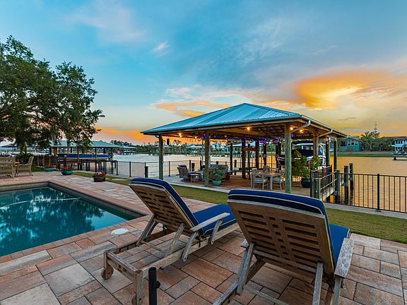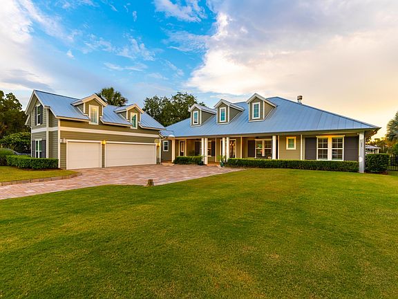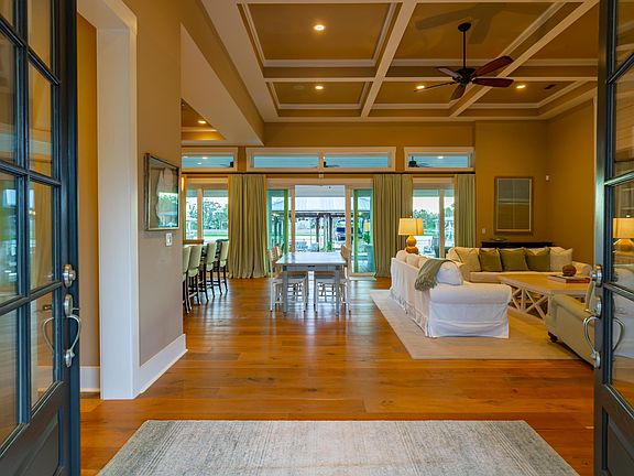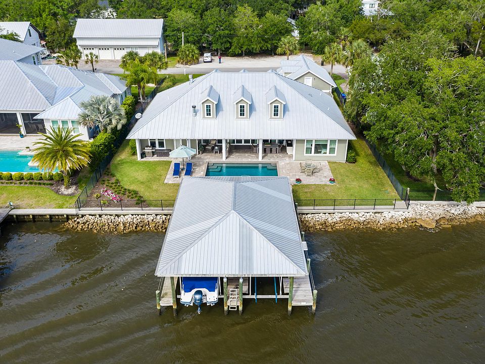 Welcome home to this beauty on the Intracoastal! It's a rare opportunity to find a single story home with this level of luxury finishes on the ICW. Custom built in 2014, the main house features 3 bedrooms and 3 bathrooms, and a detached 4th bed + bath with separate entrance above the garage. Soaring ceilings and open floor concept with large sliders to the covered patio makes this home perfect for indoor outdoor living. Gourmet kitchen, outdoor fireplace, and covered lanai screened with remote, is some of the many features. Salt water pool and boat house with two 6000 lbs boat lifts lets you enjoy a vacation style lifestyle every day!