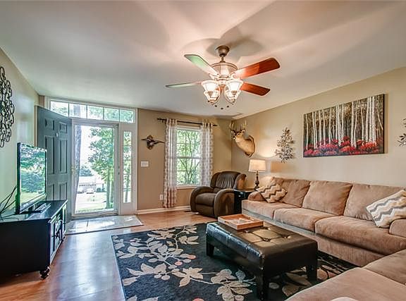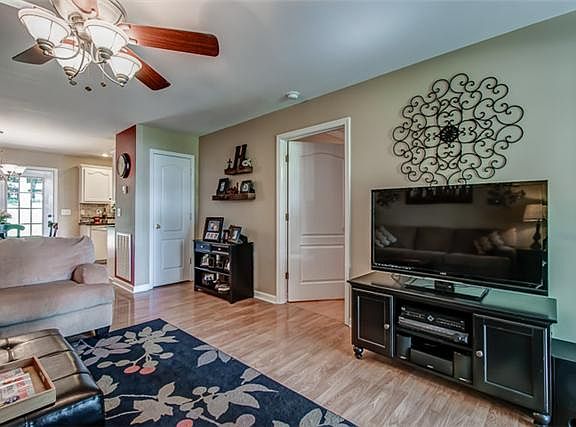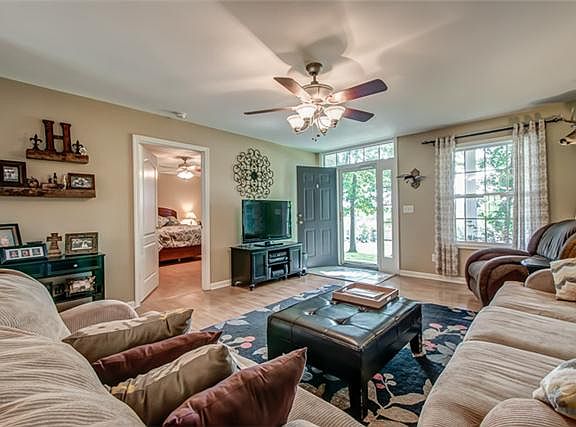 Adorable home with hardwoods throughout living areas and bedrooms, tile in kitchen. Granite countertops, crown moulding, built ins. The outdoor living space in the back is incredible with a stained concrete, expansive patio. Private wooded setting.