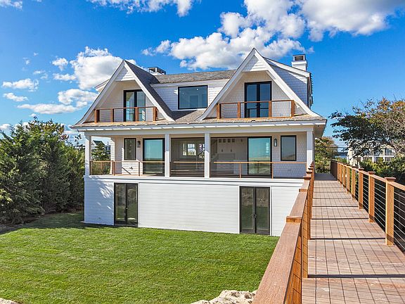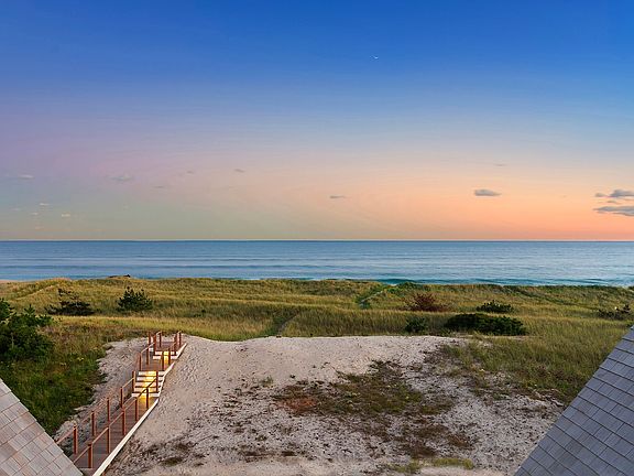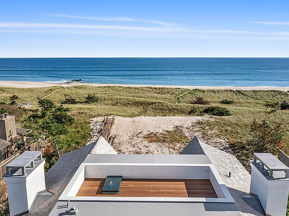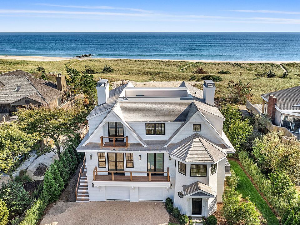 This exceptionally designed brand new build on Dune Road in Westhampton will be completed and ready for immediate occupancy. Crafted in the magnificent style of traditional Hamptons estates and finished with classic cedar shingle and shake, close attention to oceanfront architectural detail has been payed to maximize view, privacy and comfort. Five bedrooms, five full and one half bath will graciously accommodate across 4,200+/- sf of living space. An ocean or bay view is afforded to every room on the first and second floors. The first floor consists of a large great room with fireplace and views of the white sand beach and Atlantic Ocean beyond, through a wall of glass doors spanning the rear of the home. The great room is enhanced outside by an expansive covered terrace which also shades the interior from the summer sun. An elevated wooden pathway leads from the back deck directly to the ocean beach. Quartz counters and top-of-the-line appliances are custom fitted in the eat-in chef's kitchen and hardwood flooring is featured throughout. A large study, or 5th bedroom, with balcony and en suite bath offers flexibility to accommodate additional guests. The second floor offers a stunning oceanfront master suite with large walk-in closet, private covered balcony, and luxurious bath, as well as 3 additional guest suites. All guest suites offer double exposures, some with private balconies and/or walk-in closets. A laundry closet with washer and dryer is centrally located on the second level for convenience of all suite guests. The ground floor provides the entry hall, mud room, a 2-car garage, as well as significant storage space. Technical amenities include Hydro Forced Air, 3 heat/AC zones, and central air conditioning. This is truly oceanfront living at its finest.