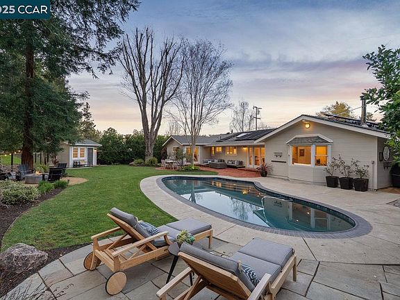Welcome to 547 Merriewood Drive, a peaceful timeless California ranch home blending indoor and outdoor living. This meticulously remodeled property offers a serene retreat in the heart of Burton Valley. The home features a welcoming Dutch door entry, chef's kitchen with custom cabinetry, and family room with vaulted beamed ceilings and 120" projection theater system. Natural materials abound – hardwood floors, custom teak cabinetry, and artisanal Fireclay Tile bathrooms with custom hickory cabinetry create an earthy, minimalist aesthetic. The updated garage features an impressive workshop space even the most seasoned craftsperson will appreciate. The private, park-like backyard showcases a saltwater pool, fire pit area, and brick patio courtyard with a second fire table. A detached office/studio provides a tranquil workspace with vaulted ceilings and HVAC. Mature redwoods, fruit trees, and drought-tolerant plantings are complemented by smart irrigation and rooftop solar. Embrace the coveted Burton Valley lifestyle – holiday light displays, legendary trick-or-treating, and community gatherings define this beloved neighborhood. Just moments from Burton Valley Elementary, Lafayette Community Park, and the Regional Trail.