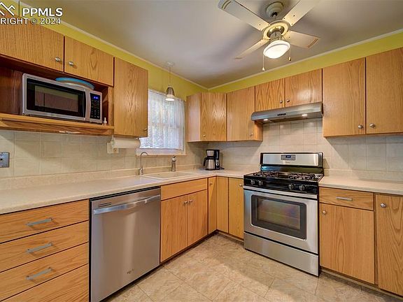 What a special find! This home is impressive for so many reasons, including it's smart updates like exterior low maintenance stucco and brick siding, partially fenced front yard, inviting sidewalk entry lined with beautiful perennials to the front entrance. The mature trees and shrubs surrounding this home are stunning. Not only providing inviting shade but also a sense of caring pride of ownership. Upon entering, the original shining hardwood floors in the upper level livingroom and bedrooms are in such well kept condition, you'd swear they were new. The kitchen cabinets have been upgraded ,plenty of storage to include 2 corner lazy susans and a wonderful full length kitcen pantry. There is also an under sink water filtration system, stainless steel appliances stay as well. The kitchen/dining area walks out to the covered 16x10 deck overlooking the huge back yard, with steps down to another 16x16 concrete patio area. Moving back inside the upper level includes the living room with gorgous bay window, 2 bedrooms and a full bath .The lower level consists of another bedroom, 3/4 bath, laundry/utility room, spacious 28x12 familyroom, and storage/office room. All windows have been upgraded to double pane vinyl. Roof for the house and shed were replaced in 2018. Water heater 2022. This home is equipped with central air for those dog days of summer. Located just minutes away from I-25, Ft. Carson, schools and parks in a delightful tree lined neighborhood.