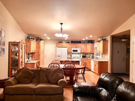 Spacious, happy home in a quiet neighborhood! One level twin home in 55+ community. Granite countertops, large island, & knotty alder cabinets in kitchen. The open concept with vaulted ceiling is perfect for large family gatherings. Gas fireplace with lovely mantel & beautiful hardwood floors. Three bedrooms & 2 full bathrooms. Master bathroom has double sinks, a jetted tub, & separate shower. 36” wide hallway & doorways with wheelchair access. Covered patio, gas barbecue, & privacy vinyl fence. Beautiful mountain views & a walking path out the back gate! Two car garage with attic storage. HOA provides snow removal, lawn & garden care, exterior insurance coverage, fantastic cable & internet, use of the clubhouse which includes pool table & ping pong, exercise room, swimming pool, hot tub, & library!