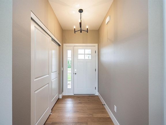 MOVE-IN READY! This beautiful Skogman Home's Garnett plan is located on a daylight lot that backs up to the community green space/park with no behind neighbors. This home features a split bedroom floor plan, stairs located at the back of the great room with a custom railing and windows going down the stairs as the main focal point. There are 10' ceilings in the great room, engineered hardwood floors in the main living area, upgraded white exterior kitchen cabinets with a buckskin stained 10' island and quartz counter tops. Custom french pantry doors off the kitchen, cabinets above the washer and dryer hookups, upgraded light fixtures, wide base white trim. Master bathroom features a tiled shower, glass door and double bowl sinks. Lower level available to finish rec, 2 bedrooms and bath. Call agent for pricing!
