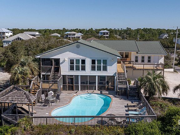 Welcome to the Sunny Surfside, your ultimate beachfront retreat! Recent updates include a new HVACs in 2023 and 2017, new exterior paint, new porch decking, new plumbing, new electrical in 2023, plus a 50 year metal roof in 2012. Situated only steps away from the pristine shores of the Gulf, this sprawling beach house offers unparalleled views and a plethora of amenities to ensure an unforgettable experience. Whether you're seeking a private sanctuary or an investment opportunity, the Sunny Surfside delivers with its versatile layout and prime location. Situated on a generous corner lot with a 3-car garage, this oasis offers both space and convenience. As you bask in the warm glow of the sunsets over the white sandy beaches, you'll find serenity by the sparkling pool in your own private yard. With 5 fully furnished bedrooms for up to 18 guests, there's room for everyone to unwind in comfort. Immerse yourself in the tranquil sounds of the waves crashing on the shore from the covered front porch or sitting on one of the two separate screened porches. Inside, discover a large living room with open concept to the dining and kitchen areas. In addition, a second living area and a game room provide ample opportunities for relaxation after a day of sun-soaked adventures. Whether you're a fishing enthusiast, kayaker, paddleboarder, or boating aficionado, the nearby activities promise endless excitement. With over $85,000 in rentals already scheduled for this year, this spacious beach house offers both luxury and potential for profit. Seize this rare opportunity and make your beachfront dreams a reality today! All information is deemed reliable but must be verified by the buyer. Buyer to verify all information during due diligence.