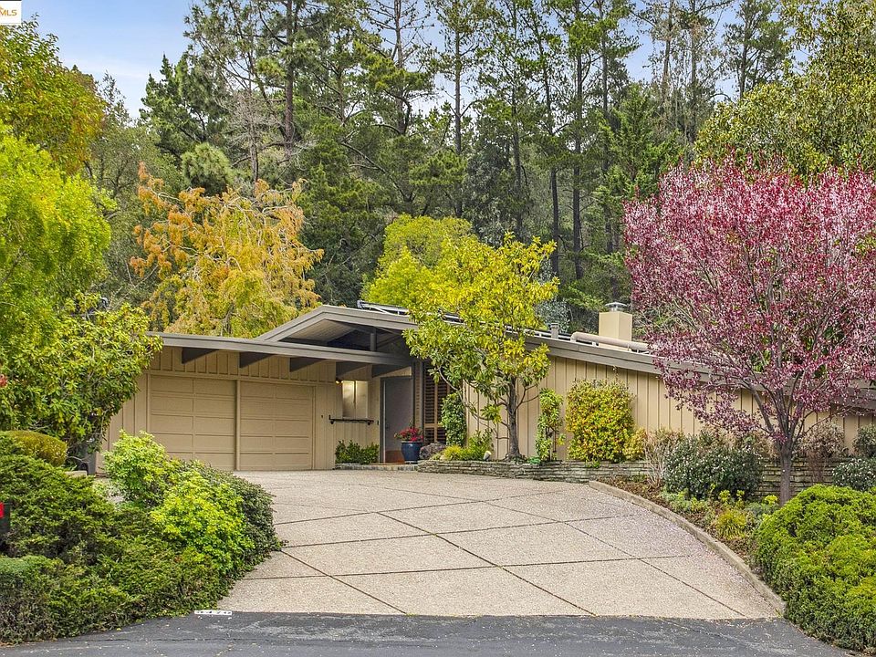 Timeless mid-century modern with stylish pool and lush grounds, this quintessential 1957 exemplar is being sold by the family of the original owners. Classic concepts of open floor plan and walls of glass resound throughout. Verdant courtyards and patios emphasize the connection with the outdoors. Light wood paneling adorns the public rooms and vaulted ceilings. An impressive stone fireplace with raised hearth centers the living room, which opens to a covered rear patio. Careful upgrades over the decades have enhanced the kitchen and four full bathrooms. The primary suite hosts two full baths, two walk-in closets, a reading area, and a private study nestled in a wooded corner. A second suite with wet-bar and mini-frig sits in the opposite wing, once a rumpus room and now beautifully appointed for guests. The sumptuous backyard is tastefully landscaped, focusing on a gorgeous pool. You will never chase friends and visitors away, but you'll be there longest. Quiet oases pepper the estate, close to nature and so happy to call this home.