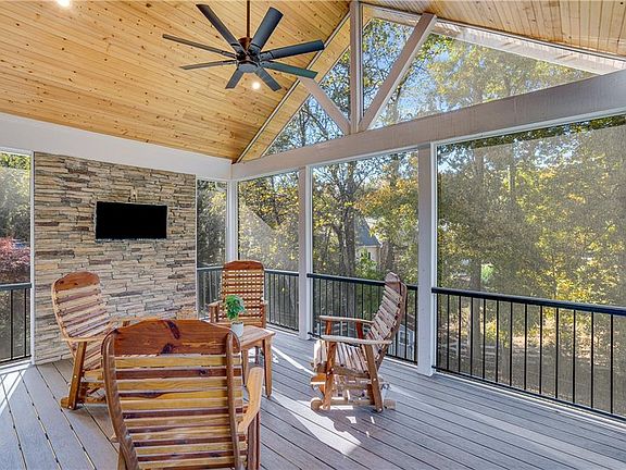 Welcome home to this meticulously maintained retreat that perfectly blends comfort, privacy, and adventure. Tucked behind a gated driveway and fenced property, this inviting home features an open-concept floor plan filled with natural light, a vaulted great room with exposed beams and a beautiful stone fireplace, and a gourmet kitchen with solid surface countertops, stainless steel appliances, and a sunny breakfast area. The main-level primary suite offers a true escape with a spa-like bath featuring an oversized shower, clawfoot soaking tub, and dual vanities, while two additional spacious bedrooms share an updated hall bath. The finished terrace level provides flexible living space ideal for a recreation room, gym, or guest suite with an additional full bath. Enjoy year-round outdoor living on the screened porch with stone accents, the grilling deck, or the expansive covered patio overlooking the private yard and cozy fire pit. With a two-car garage, RV/boat parking, and a private path leading to the community dock and easy lake access via Tidwell and Pilgrim Mill, this home offers the perfect blend of relaxation, recreation, and refined lake living.