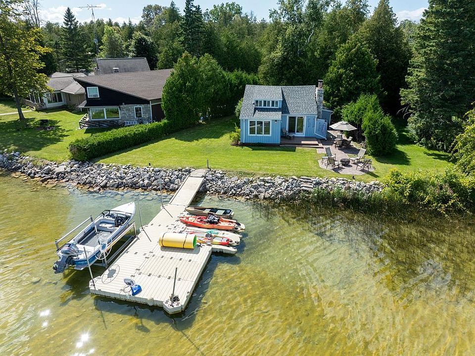 Set along the peaceful shores of Clark Lake, this beautifully appointed seasonal cottage offers a seamless blend of charm, comfort, and elegance. Featuring two bedrooms, a full bath, and a spacious loft for additional guests, the interior is warm and inviting with vaulted ceilings and a striking stone fireplace. The kitchen is thoughtfully designed with quartz countertops throughout and a generous island, perfect for gathering and entertaining. Enjoy morning coffee in the sunlit porch, peaceful afternoons on your private dock, and evenings around the lakeside fire pit—all surrounded by the quiet beauty of Door County.