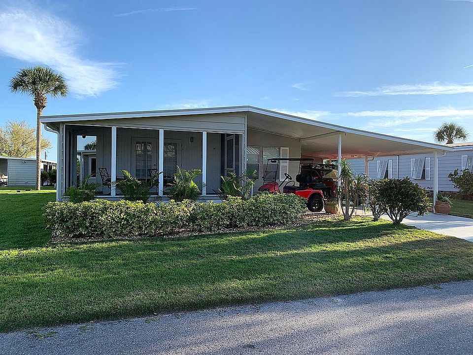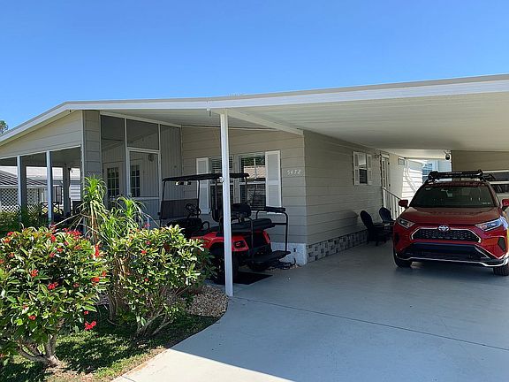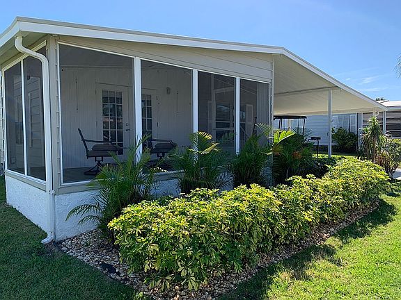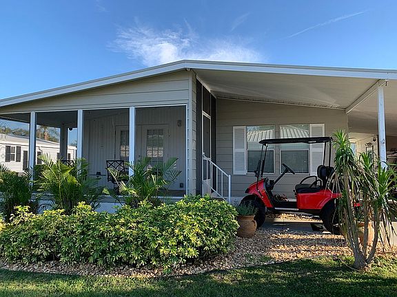 Turnkey - Just move in! Beautifully fully Furnished. Partially RENOVATED IN 2019! EZGO Gas Golf Cart included! You must see this beautiful 2 bedroom/2 bath home with luxury wood look ceramic tile flooring through main living area, baseboard and chair rail moldings, high end lighting and ceiling fan fixtures, spacious tiled walk-in showers, attractive framed windows and doorways. New water heater & plumbing in 2021 Vapor barrier repaired in 2022. Open concept floor plan for a sunlit living area with cathedral ceiling which lends to the spaciousness of the home. A spectacular granite kitchen is perfect for entertaining and provides endless storage space including center island with pennant lighting. Off of the living room via french doors is a very peaceful and relaxing tiled screened porch with view of the lake and surrounded by lush tropical landscaping providing the perfect amount of privacy. Both bathrooms have been nicely updated and boast large walk-in showers and comfort height commodes. A double shed allows for extra storage and dedicated laundry room with washer and dryer. The park auditorium is directly across the street for easy access to the supersized pool, whirlpool and various poolside sports games. Camelot Lakes is a beautiful, gated resort-style community where your monthly lot rent includes water, sewer, trash/recycling curbside, lawn maintenance, taxes and endless upscale amenities and organized activities. All shopping needs, great restaurants and entertainment are just minutes away via quiet back roads or easy I-75 access. Tired of having everything at your fingertips? Take a 7 mile drive to the beautiful quartz sand beaches of Siesta Key. Take a dip, throw out a line or enjoy an energizing walk along the shore. A never ending supply of quaint shops, top restaurants and some of the nicest people you'll ever meet!