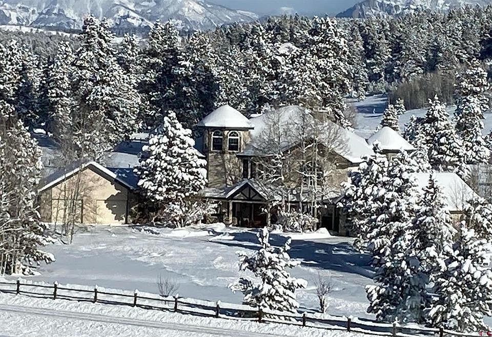 Mountain Craftsmanship in central neighborhood with breathtaking views of the northern San Juans. This stunning home sits 10 steps away from a San Juan National Forest gate, providing 41 miles of hiking, mountain biking, and horseback riding trails, and yet just minutes to shopping and amenities. In addition to 2 home offices, the home contains multiple flex spaces that could be used as playrooms, studios, or additional bedrooms. Constructed with a low-maintenance exterior and splendidly landscaped, the outdoor living space is equally as grand as the interior. The interior exudes warmth with quality custom woodwork, three fireplaces and fine fixtures throughout; hardwood flooring, newer carpet, large high quality windows, and oversized patio doors that bring the outdoors inside. The kitchen is appointed with coffered ceilings, granite countertops, dual Jenn-Air built-in refrigerators, Viking gas-fueled oven/range, warming drawer, a full gas barbeque buffet on the deck, and a butler’s pantry leading to the laundry room, an office, and a ¾ bath. A dining area, the coziest of parlors, two guest rooms, and a full bathroom complete the main level. Take the elevator or the stairs to the upper level overlooking the forest and mountains and find an executive office, media area, library, powder room, and a grand wet bar for entertaining friends. The primary suite is appointed with a private deck, a fireplace, a walk-in closet, and a remodeled master bath. You can escape to the top of the turret to view the stars or create a masterpiece. Updates include main door video and intercom, efficient furnaces, Starlink with exceptional internet speed (often significantly over 150 MBPS) and new washing machine. For your guests find RV parking with a water hookup only. Horses allowed, ride right from your property into thousands of acres in the San Juan National Forest.