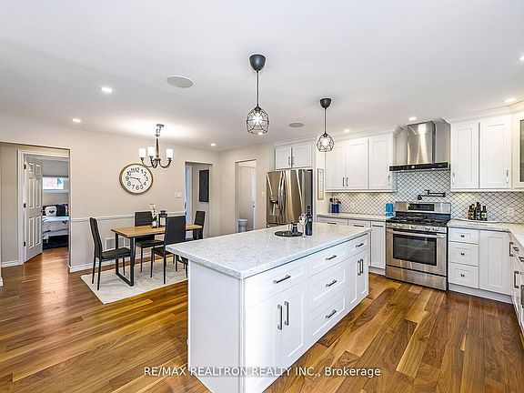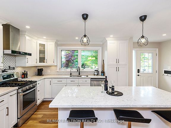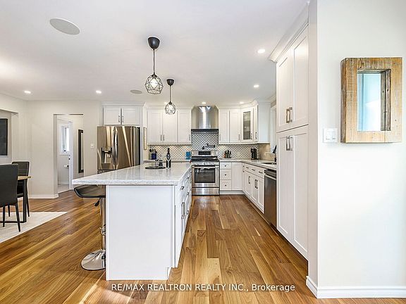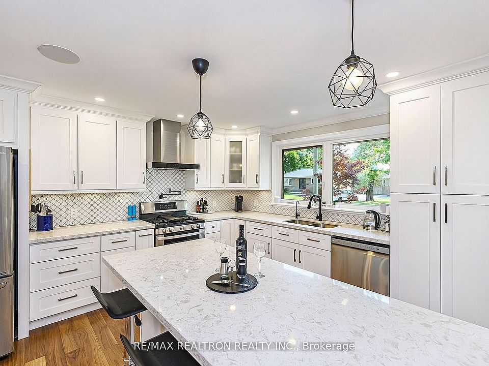 Nestled in a tranquil crescent on a large lot with mature trees, only two streets north of Lake Ontario. Over 275k spent in 2018, renovated from the ground up with an addition, boasting an impressive 3,190 sq ft across 2 levels! The main level is adorned w/engineered hardwood, while the lower level is complete w/broadloom. Enjoy the ambiance created by dimmable pot lighting &a built-in speaker system throughout. The kitchen is a chef's dream, equipped w/premium LG appliances, including a gas stove & pot filler, along with a water purification system. Custom wood cabinetry, elegant crown molding, quartz countertops, ceramic backsplash, & center island make it perfect for entertaining! An inviting 3-sided gas fireplace adds warmth to the open-concept living, dining, & kitchen areas. The formal living space overlooks the front yard that also offers a deck, ideal for relaxing in evenings. The home features 3 bdrms & an optional family rm that can serve as a 4th bdrm, all with impressive 9.5" ceiling heights! The primary suite is a retreat, showcasing a w/i closet & spa-like bathroom complete w/his & hers showers in a ceramic-tiled space w/a frameless glass enclosure, dual vanities, quartz counters,& a sleek pocket door! Step out from the primary suite to your private deck, perfect for enjoying a morning coffee or unwinding in the hot tub. Two additional well-sized bedrooms are perfect for children & share a 4-pce bath. A long hallway leads to the family rm, which features large windows & access to another deck, making it perfect for summer bbq's! The Basement offers a sep. side entrance, recreation area w/bar, games rm with billiards/ping-pong table, separate laundry rm, spacious gym w/above-grade windows, storage area & a bdrm w/an ensuite bath, ideal for hosting family during holidays! Pool-sized backyard, previously used asa skating rink in winter months! This meticulously cared-for home is ready to welcome its new owners. Schedule your visit today!