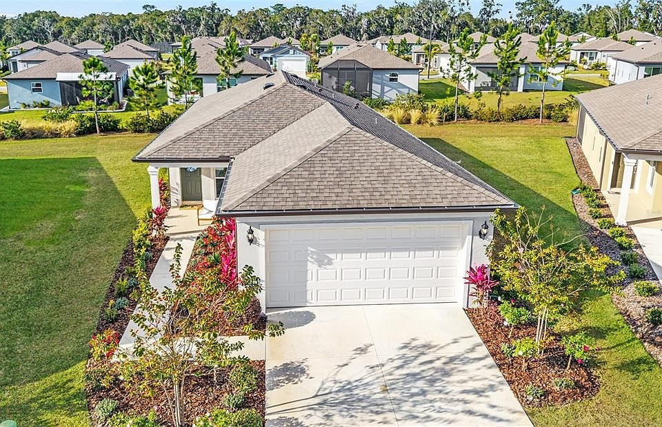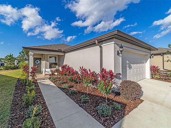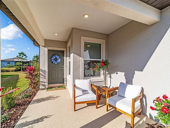 Located in the heart of the premier Del Webb Stone Creek community in Ocala, this stunning move-in-ready residence perfectly blends modern design with the ease of Florida living. From the moment you arrive, the home impresses with its meticulous curb appeal, featuring professional landscaping with lush tropical plantings, manicured mulch beds, and a clean, neutral exterior palette complemented by a spacious two-car garage. The inviting covered front porch, adorned with a charming floral wreath and stylish seating, provides a tranquil spot for morning coffee before stepping through the front door into a sun-drenched foyer. Inside, the open-concept layout is defined by luxury plank flooring, cool-toned walls, and elegant finishes that flow seamlessly from the entryway into an expansive great room. This central living space is anchored by a contemporary entertainment center with an integrated electric fireplace, while large windows flood the entire area with natural light. A versatile flex room with double doors sits just off the foyer, offering the ideal footprint for a quiet home office or den. The gourmet kitchen overlooks the living area and features bright cabinetry, high-end stainless steel appliances, and a breakfast bar that makes entertaining effortless. Adjacent to the kitchen, the dining area provides a bright space for meals with views of the manicured surroundings. Every detail of this home, from the designer finishes to the airy, light-filled atmosphere, has been curated to offer a blend of comfort and style within a vibrant and beautifully maintained neighborhood.