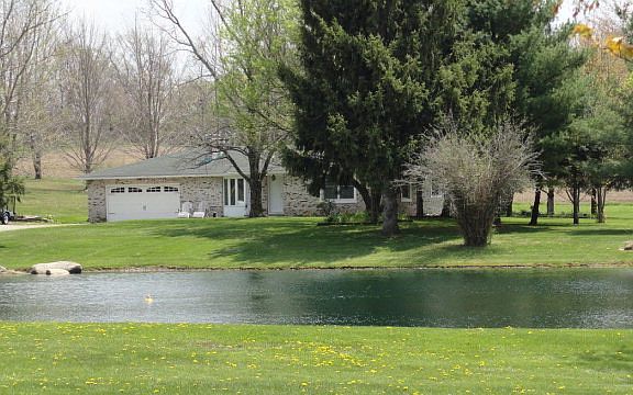 Truly a rare find! Ranch home situated on 7 plus acres, well back off the road with 3/4 acre stocked pond. Breathtaking view with orchard. Many updates, including steam shower in master bath, all ceramic tile, all new flooring. 42x30 Pole building with concrete floor perfect for home business or handy person. Oversized 2 car garage.