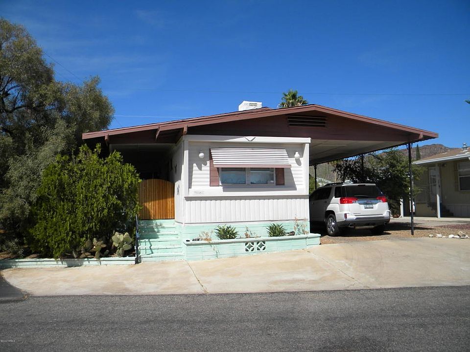 Front & rear bedroom plan in Tucson Estates. Home has Ramada type roof on an arroyo lot, very well maintained and recently painted on outside. Recent Pergo style floors. Private shaded outdoor patio. Ideal for winter home. Over 55 community where you own your own lot. Play golf everyday. Community pool & clubhouse.