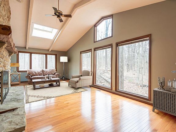 This 3 bedroom, 2 full bath ranch over a walkout basement is nestled in the woods on 5.06 acres minutes from eastside amenities on a dead end street. This home provides privacy and quiet in a beautiful setting with magnificent views in Kingston Estates. This is a one owner home. On approach the front of the home has a large front deck with ramp for easy access. The entry way is ceramic which transitions into beautiful wood flooring that carries down the hall and living room. The spacious living room with vaulted ceiling, and skylight has a beautiful floor to ceiling stone wood burning fireplace with natural wood mantle. The kitchen is great size with lots of counter and cabinet space which has ceramic tile that matches the entry. Access to large rear deck is off the kitchen. The primary bedroom has an attached full bathroom and access to the rear deck. The full bath off the hall convenient to the other two bedrooms has been redone with a zero entry shower and grab bars. The basement could be finished out or leave as is for plenty of storage. Besides the oversized attached garage there is a detached garage with stairs and second floor for more toys and storage. Regardless of where you are at in the home you enjoy amazing views. Great location a mile from town that gives a peaceful wooded setting to enjoy nature.