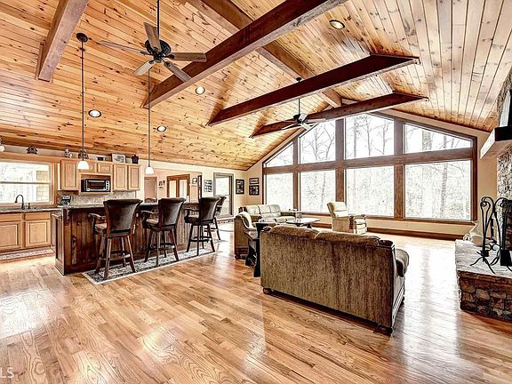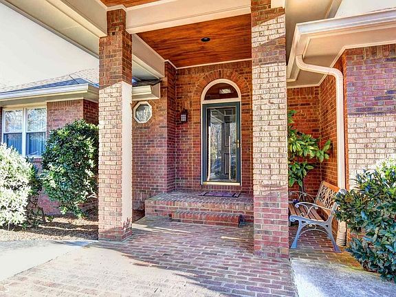 Always on deep water. Gorgeous year-round lake views w/single slip covered dock in backyard! Curb appeal abounds w/stunning brick ranch home nestled down long driveway w/porte-cochere complete w/custom built 4-car garage capable of accomodating bass boat. Beautiful grand room w/vaulted tongue & groove ceiling w/custom beam detail, stacked stone fireplace, built-in bookcases & picture windows opens into kit w/large island w/bfast bar, granite ctops, ss apps & bfast area. Separate dining rm leads to covered back deck. Main master suite w/2nd fireplace, trey ceiling & x-large en suite. 2nd master suite w/travertine en suite w/custom vanity. Two bonus rooms & workshop in terrace level. Large patio to gentle slope w/lake & dock just steps away.