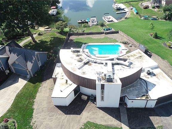 Much more than just a lake house, It is a lifestyle. Enjoy the beautiful lake views all year round!   Waterfront home designed by local Architect Arthur Compton Marks has the look of a Frank Lloyd Wright design. Home has 3 bedrooms, 2 full baths, 2 car garage and an in-ground pool. Enjoy the gorgeous view of the lake from every window! Each room has a welcoming feeling with immense character. Walk out to the patio and enjoy the in-ground pool or walk down to the dock to the lake and pontoon boat. Open floor plan with large windows provides a lot of natural light.  Home is ready for your personal touches.  Updated electrical panel box.