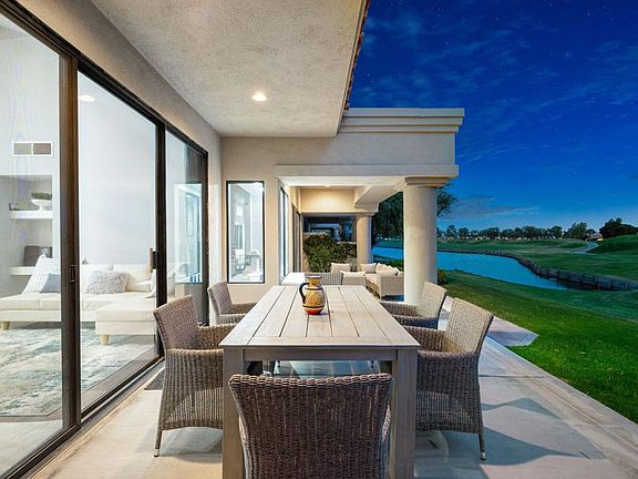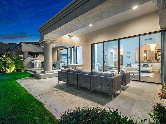 South Facing with panoramic Santa Rosa Mountain views!! Enter through the upgraded front entry gate through the professionally landscaped private courtyard to the updated glass front entry door to this Legends 31 floor plan with walls of glass, 3054 Sq. Ft. of living space, 3 large en- suite bedrooms, Powder Room, dedicated open dining room, large family/living room with wet bar, and updated kitchen. With the glassed-in atrium the entire interior of the home is always light and bright. The interior is contemporary designed with light colors, marble, wood plank, and carpet flooring. The remodeled kitchen with quartz counters has all newer appliances including wine cooler and Induction cooktop for instant no flame heat and opens to a spacious Morning Room with views of mountains and access to the patio. This well designed architectural plan offers vaulted and open-beamed ceilings, with an open Family Room with fireplace and mountain views. The spacious rear patio offers amazing southern views of the the famous #5 hole 'Double Trouble', on the PGA West famed Pete Dye Stadium Course, home of the annual American Express PGA Tournament every January. PGA West offers 6 championship courses and 3 Clubhouses. The HOA's include maintenance on building/grounds, landscaping in front, back, side, and courtyards, irrigation water/equipment, exterior paint, roof, cable, internet, and 24 hour guarded gate/security. Furnished per written inventory.