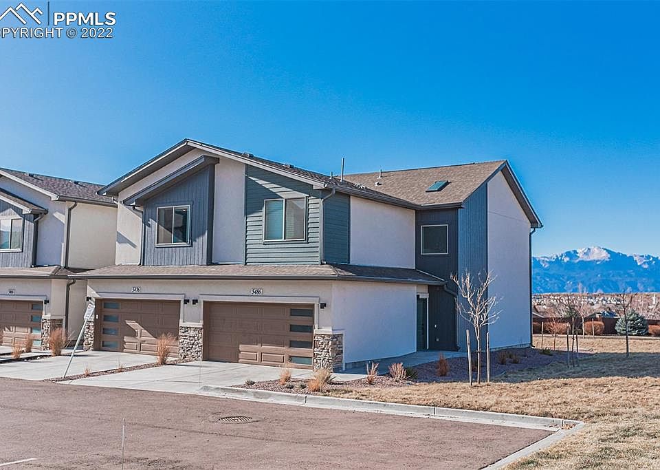 Maintenance free living with mountain views! Great location and one of the best units in the complex that offers unobstructed views of the Pikes Peak, front range and beautiful city lights, 2 car garage with full driveway, back yard, easy access to guest parking and located at the end of the street. This open concept features spacious double master suites with attached bathrooms and walk in closets. Open kitchen with beautiful quartz counter tops, stainless appliances, large pantry, luxury vinyl plank flooring, spacious laundry room, cathedral ceiling and living/dining room that leads to sunny rear patio. Beautiful stucco/stone exterior, all rooms are open and spacious with 36" wide doors, extra storage area, and central air condoning. Low HOA dues and close to all amenities!