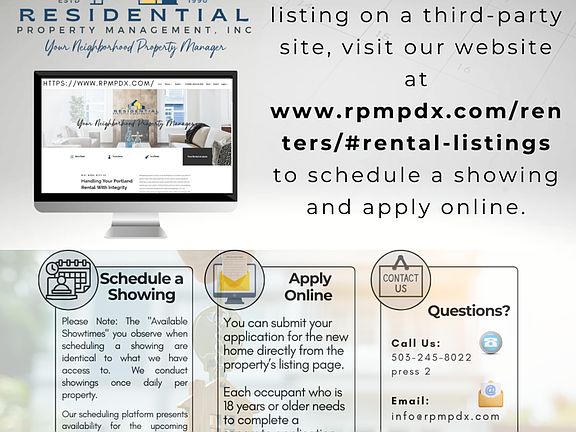 If you have any questions regarding this home, please contact Residential Property Management, Inc. at info @ rpmpdx . This second-floor/corner unit condo offers a serene view of the community's lush green space and easy access to your parking space. The open-concept layout features hard surface flooring, ample storage, a cozy dining nook, and a galley kitchen with a window above the sink. Enjoy your balcony, perfect for relaxation, and a spacious bedroom with a walk-in closet. Water, sewer, and garbage services are included in your rent. Your new condo is ideally situated near the Sequoia Park community center and pool. Enjoy quick access to Hwy 217 via the new Allen Road/Denney Road bypass, which connects you to I-5 or Hwy 26. Discover downtown Beaverton's lively Farmer's Market, vibrant restaurants, shopping, parks, community events, and more! Screening Fee: $64.95 per occupant aged 18 years or older. Lease Start Date: Must be within 5 - 14 calendar days following the approval of your application. Lease Duration: 1 Year Security Deposit Minimum: $1,250.00 Security Deposit Maximum: $3,125.00 Pet Information: Sorry, no pets will be considered. Parking: No additional cost for parking ESA and Service Animals are Welcome. RENTERS INSURANCE REQUIREMENT: Before the lease commences, the tenant must provide proof of renter's insurance with a minimum coverage of $100,000 for General Liability. Manager/Agent complies with ORS 90.222. INFORMATION DISCLAIMER: While we try to provide accurate information, we cannot guarantee its accuracy or reliability. Prospective applicants should independently verify all details about the property, neighborhood, and surrounding community before applying. We do not offer warranties or guarantees regarding the accuracy or timeliness of the information provided. Please be aware that pricing, lease terms, availability dates, pets, and others are subject to change without notice. We strongly recommend you review the marketing details again before applying. Smoking and vaping are strictly prohibited in our rental properties, including homes, condominiums, ADUs, and townhomes. NO GUARANTEE: We market and lease our properties in their present cosmetic state. Neither the Agent nor the Owner commits to any interior or exterior improvements, including, but not limited to, interior painting, flooring, fixture or landscaping enhancements, yard maintenance, or similar improvements before occupancy. Our homes are prepared for occupancy, ensuring high cleanliness standards, including sanitized surfaces and carpets. Repairs are completed per ORS 90.320 regulations. The Agent/Manager determines cleanliness standards, with their decision being final. 1 Bathroom 1 Bedroom 1 Reserved Parking Space Community Center And Pool Greenspace Hard Surface Flooring Oven Spacious Interior Storage