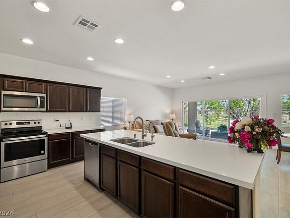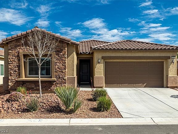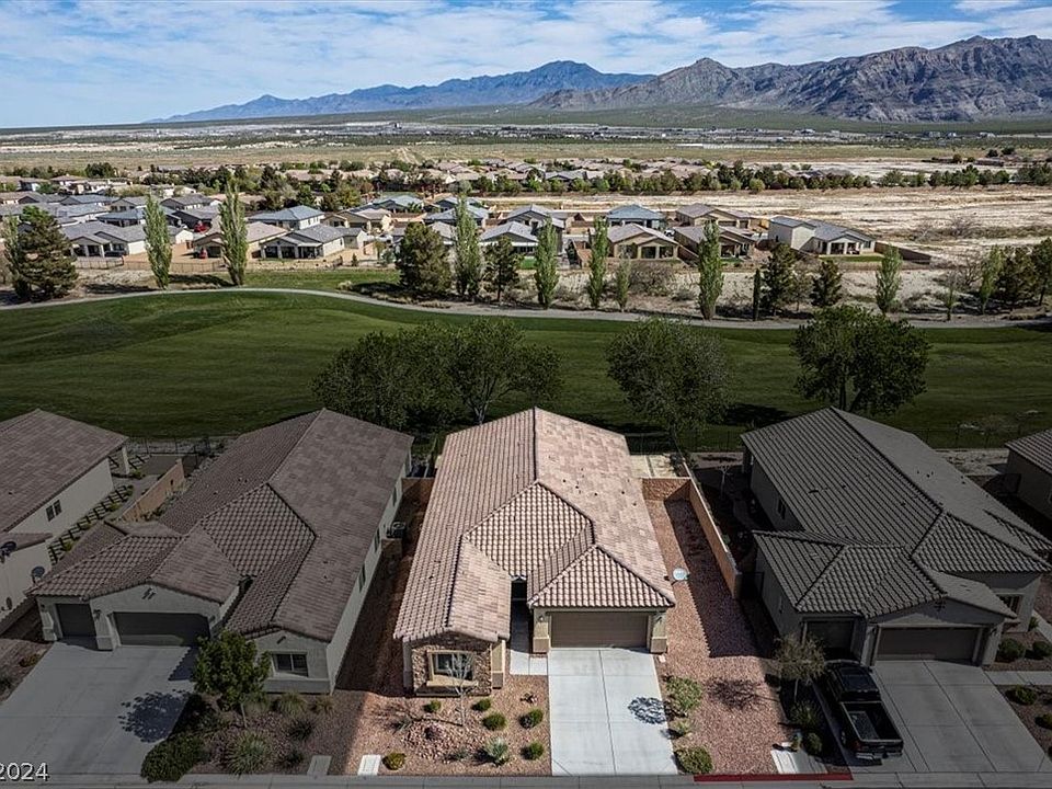 Welcome to your sanctuary in the esteemed Mt. Falls Golf Course community, where luxury and natural beauty converge. This stunning 2019-built home is located directly on the golf course and boasts 3 bedrooms, 2 full bathrooms, and a 2-car garage, all set against the backdrop of breathtaking mountain vistas. Step inside to discover tile floors in the living areas and plush carpeting in the bedrooms, offering both elegance and comfort. The kitchen is a chef's delight, featuring quartz countertops, custom cabinets, & stainless appliances. Triple slider glass doors beckon you to the back patio, where you can savor the serene views of the mountains and green of the golf course while enjoying the gentle breezes. This lovely home also offers an additional room to be used as a den, office space, or you could convert it into a 4th bedroom. The proximity to Las Vegas adds convenience and excitement. Don't miss the opportunity to make this your dream home in an idyllic golf course setting.