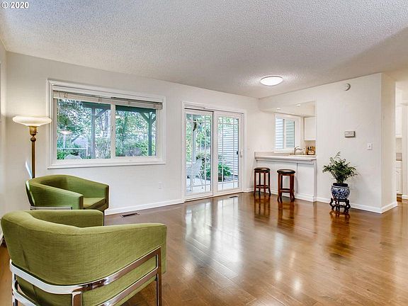 Townhouse style condo in the heart of Beaverton. Immaculate 3 bedroom end-unit. Enjoy coffee from upper balcony, overlooking secluded backyard, beautiful trees. Condo boasts double pane Milgard windows, hardwood floors on main & freshly steamed carpet upstairs. Half bath & included washer/dryer on main. French slider to huge patio, tons of storage, Murphy bed, stylish window treatments. HOA provides spacious garage, 2nd parking spot, swimming pool, RV parking, all landscape maint. Watch 3D Tour!