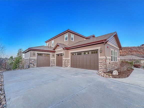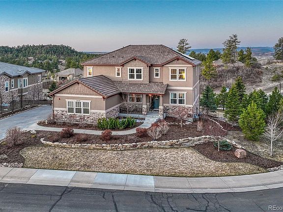 Welcome to Timber Ridge--A community hidden in the trees! This exquisite 4-car custom home with stunning Pikes Peak & Castle Rock views sits on a nearly 1/2-acre professionally landscaped lot! With unmatched finishes & thoughtful upgrades, every detail of this custom-designed home reflects a deep commitment to quality & craftsmanship. Built for the discerning buyer, this property showcases an elevated standard of living with no expense spared. Low taxes with no metro district are an extra benefit. The family room with custom fireplace invites you to the open-concept eat-in granite kitchen featuring custom cabinetry, pro-series Jenn-Air appliances, & finishes that blend style with function. Formal living & dining rooms allow entertaining at its finest. The study features built-in floor-to-ceiling cabinetry & bookcases. Step on the 425 SF covered composite deck to view the extensive professional mature landscaping, 4-point water feature, built-in fire pit, views of Pikes Peak & the historic Castle Rock Star at the holiday season. The upper level features a primary suite with custom en-suite 5-piece bath with free-standing tub, additional bedroom with en-suite bath plus 2 more bedrooms with a Jack & Jill Bath. The walk-out custom basement features a Colorado contemporary feel with recreation & game rooms plus wet bar. Enjoy hobbies at the bedroom with built-in cabinetry & work space along with a 3/4 bath. The extra finished pantry provides easy storage and function. The home’s 4-car garage is a true standout—fully finished with built-in closets, upgraded flooring, & custom lighting. It's more than just a place to park; it’s an extension of the home, offering the same level of attention and quality as the interior. Additional highlights include a fully-paid 10KW solar system, 16-camera security system, whole-house fire suppression system, whole-house humidifier, tankless water heater, air compressor, flood sensors, brand-new exterior paint, & extensive smart features.