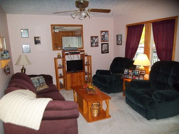 Drive a little save a lot. 2400 square foot ranch in move in condition that features a large family room, pool table stays. Dining room has cathedral ceiling and cherry trim. Split plan has 2 bedrooms on one side and 3 on the other. One is used as an office (high speed internet is available through horizon)and another as a huge walk-in closet. There is a huge l-shaped pantry and another large storage room off the family room. There is a basement area that they use for wood storage with a garage door plenty of room for the riding mower etc. Nice deck on the front and a small deck to the rear with a very nice view. Circular driveway. Above ground pool with fencing and storage for equipment. 2 200amp sevices.