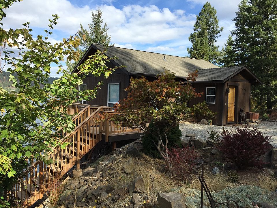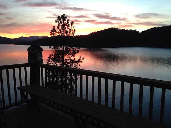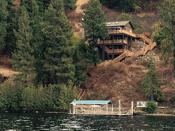 SPECTACULAR SUNSETS! Tremendous value for waterfront home at North end of lake. Beautiful West facing setting with 180 degree views, spanning from Cd'A Resort down lake. Deep water frontage. Close to Gozzer Ranch Lake Club-Enjoy the life up on the hill, then relax at your private waterfront getaway! Gated neighborhood. Multilevel decking with stairs leading to private dock with covered boat slip. Hot tub off master, upgraded security system, interent/cable. Nice large interior storage area. Heating/AC new in 2014, bathroom remodeled in 2015. House, deck, stairs, dock, and dockside deck freshly painted and stairned. Best deal on a lakefront home with these views and location! Furnishings and other personal property are negotiable. Separate buildable lakefront lot next door for $129,900.