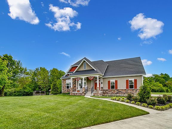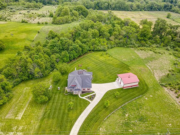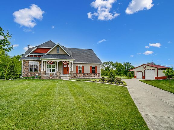 Welcome to 548 Bischoff Rd in New Carlisle!! You will be amazed at the quality & craftmanship throughout this custom home built in 2013 by Peebles Construction. Nestled on 5.04 gorgeous acres, this home has over 2000 sf on the main level plus a well finished basement & an enlarged 2 car attached, insulated garage. Enter into the spacious foyer with direct views to the great room, dining area & kitchen with hand scraped tongue & groove wood floors. Great room has 15 ft vaulted ceilings with cedar beams, stone wood burning fireplace, built in bookshelves with moveable ladder & a beautifully restored 100 year old stain glass window. The open kitchen has a stone island, granite countertops, soft close maple cabinets, large pantry & all appliances. To the left of the entry way are the two guest bedrooms & a full bath. Tucked back off the great room is a wonderful master bedroom with en suite & generous closet space. Spacious master bath has soft close maple cabinets, split vanity areas and walk in shower. The laundry room with washer and dryer & the cedar wood screened porch round out the main level. Down the wide, open staircase is huge family/rec room with tons of natural light from the oversized windows. Perfect for entertaining, this level has its' own kitchenette & eating area, full bath with tub & another room that can be utilized as a bedroom, office, etc. Entire home has solid core doors, upgraded trim package, custom blinds and Hunter Douglas ceiling fans. This extremely energy efficient home has all electric Geo-Thermal HVAC & 14 solar panels. The 30 x 40 outbuilding has side porch to enjoy the views, RV door & hookups, & automatic doors. Many outdoor features to cover all your entertaining needs: outdoor kitchen with grill & pizza open, lots of seating areas, firepit, rock fountain, wildflower meadow & more! Ask your agent for list of additional features and upgrades!