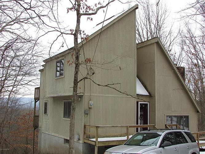 GREAT Contemporary mountain view home with three bedrooms, two full baths, master bedroom has a private balcony, there is a wraparound deck, and a lower deck for this breathe taking view of NJ Pa, Living room with fireplace, a circular driveway, full basement with walkout double doors. Enjoy all the amenities -- indoor and outdoor pool, clubhouse, tennis courts and lake, near major attractions and easy drive to 80. Motivated Seller.