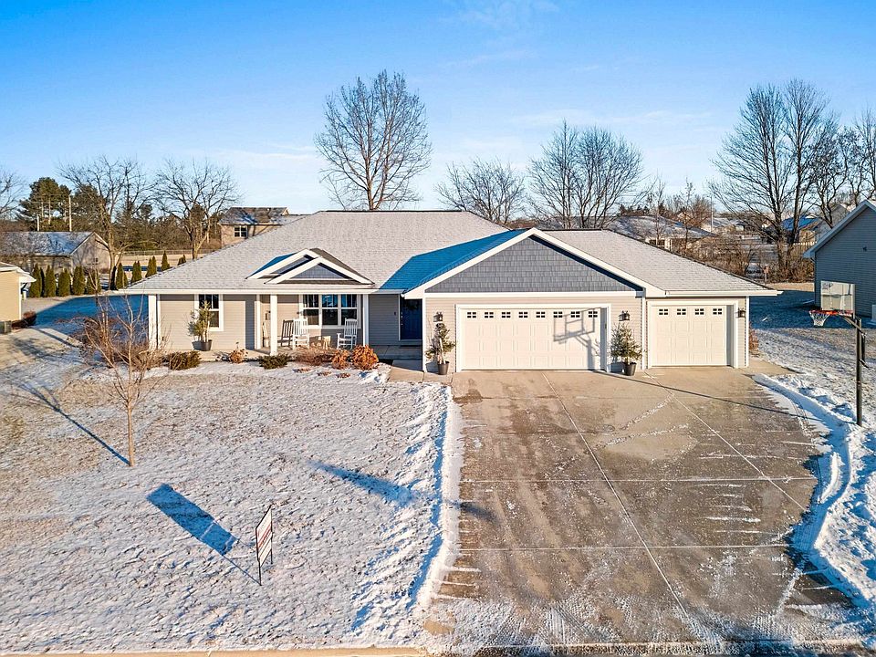 Charming, meticulously maintained home in a sought-after neighborhood near parks and schools. The open-concept floor plan features cathedral ceilings and a spacious dinette with patio doors leading to a private outdoor space. The kitchen is a standout, offering custom maple cabinetry, an island with storage and seating, a pantry, and stainless-steel appliances. The master suite includes a walk-in closet and private ensuite bath with walk-in shower. A fully framed basement with egress window and plumbing for a future bath provides endless possibilities. Additional features: 1st-floor laundry, attached 3-stall garage, stacked stone fireplace, and an above-ground heated pool with Trex decking. 48hrs for binding acceptance.