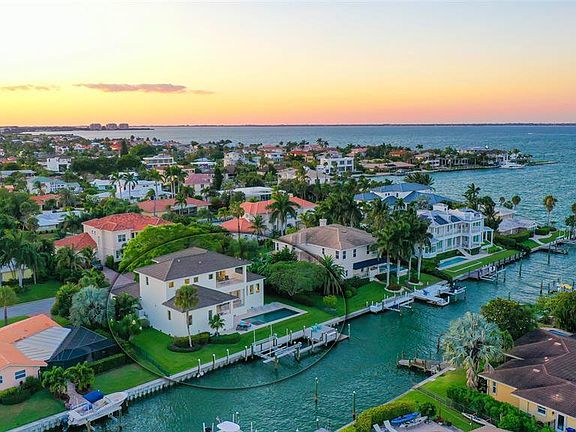 Tranquil Country Club Shores offers the best of both worlds with proximity to world class amenities and waterfront luxury lifestyle. Situated three homes in from Sarasota Bay, this "better than new" exquisite property has it all - just bring your swimsuit and move right into this turn-key beautiful home. You will be mesmerized by the incredible collaboration of architect Mark Sultana and Voight Brothers construction in the creation of this spectacular modern-coastal masterpiece. When you enter the home, you will be bathed in the tranquility of water views that immediately envelopes you with calmness and removes the daily pressures. Just shy of 4,000 sq ft of living space (5,669 sq ft under roof), all your living and spa-like enjoyment in the master retreat is on the main level, with a private office accessed via French doors, and an impressive great room, with a fireplace and walls of windows to seamlessly bring the outdoors in. The second level boasts three grand ensuite bedrooms, a loft reading room with a wet bar, and bonus/media room. The 10' hand-crafted mahogany door warmly welcomes you into the elegant foyer, with light and soft blue hues reflected by the water from every angle. The expansive foyer has 24' ceilings, and further drama is created with coffered and coved ceilings throughout, as well as state-of-the-art Creston smart home automation for soft lighting and ceiling fan control. For privacy and convenience, remote controlled Hunter Douglas window treatments are integrated throughout the first floor. Entering the living space from the grand two-story foyer, the spacious great room offers the ultimate in relaxation and enjoying expansive views of the water. The chef's kitchen is connected to the great room via a dining area defined by 15' of aquarium glass to accentuate the water views. The casually elegant kitchen is outfitted with high-end Sub-Zero and Viking appliances, a walk-in pantry, and incorporates an oversized quartz island with built-in wine captain, and barstools for friends to gather. The spacious master retreat creates a private inviting space with easy access to the terrace, and pool and spa for a midnight dip. The master bath incorporates an oversized soaking tub that is beautifully ensconced in seashell mosaic tile. Separate vanities walk-in shower with multiple heads, a private water closet, and linen storage, and a large, customized walk-in closet make it easy to feel like you are on vacation. The recently installed Trex dock features a 20,000 lb boat lift, paddleboard storage, an integrated kayak launch, fish station, and low voltage piling lights. The 112' of canal frontage allows you to enjoy Sarasota Bay and the Gulf of Mexico from your expansive dock, designed to capture the true lifestyle of Longboat key. The two plus car garage has great overhead storage, a utility cove for a workbench or a refrigerator, and high ceilings if you want to install a multiple car lift. A Tesla charger is also included. Residents of Country Club Shores enjoy private deeded beach access to the one of the most spectacular sugar-sand beaches the Gulf of Mexico has to offer. The Resort of Longboat Key Club offers several memberships for world-class golf, tennis, fitness, spa, and several exceptional dining choices. St Armands Circle is 10 minutes away with shopping, dining, and many entertainment options. Come live this incredible casual lifestyle that Longboat Key offers.