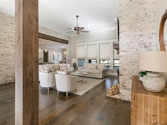 This beautiful 7 year old home is located on one of the largest lots in gated Coquille Subdivision and has so much to offer! Walk in and fall in love with all of the fabulous amenities: 4 bedrooms and 3 full baths; exposed wood beam in living room and beam column; large living room with center wall fireplace; exposed brick opening between the living room and kitchen; formal dining room; chef's kitchen with large contrasting island (including cabinets below), farm sink, pot filler, beautiful backsplash, under cabinet lighting, stainless appliances including refrigerator; whole house water filtration system; butler's pantry with wine cooler; engineered wood floors in all living areas + all bedrooms; spa-like primary bath includes stand alone tub, dual vanities, large walk-in shower and custom closet with built-ins; two bedrooms share jack n jill bath; bonus room/playroom up; surround sound in living room & on patio; walk-in attic; gutters. Washer & dryer as well as TV's remain; storage closet in garage. The screened porch and extended patio look out to the oversized fenced yard. BONUS: workshop with spray foam insulation, paneled walls, electricity (220V) and AC! Flood Zone C; great school district.