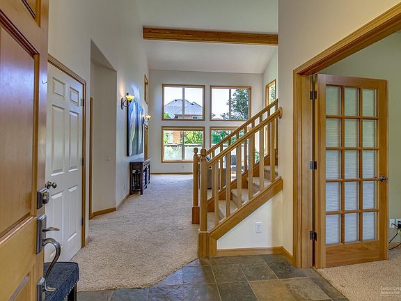 Beautiful Westside Heights of Bend Home. Freshly painted exterior Plenty of natural sunlight in this beautifully designed home with an abundance of windows bringing the outdoors in. See through fireplace is enjoyed by both living room and dining/kitchen. Spacious master is on the main level, with double vanity, soaking tub and a private slider to a private patio. French doors lead into the large office area which could also be a den-media room. Beautifully refinished maple wood floors and new carpet going in. Outdoor living abounds with generous front and back decks opening up to gardens in bloom. The level lot affords a nice sized usable yard. High ceilings in garage for the storage you need for the Bend lifestyle.