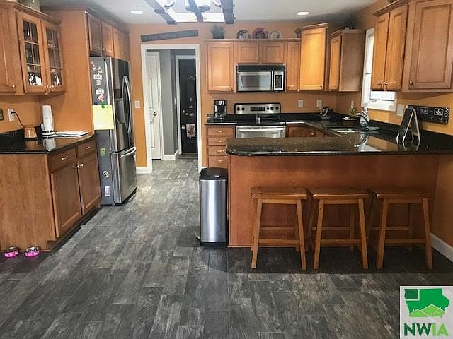 This lovely brick-front ranch-style home is very open, spacious, bright, and extremely well-maintained. Boasting 3 bedrooms on the main floor, 1 bedroom in the newly and lavishly finished basement, along with 2 bonus rooms in the basement that could easily be converted to bedrooms. 2 bathrooms on the main floor along with a beautifully finished brand new bathroom on the lower level, complete with a spectacular walk-in tiled shower. The foyer opens up perfectly to the great room, showcasing 10' ceilings and a gas fireplace. Kitchen is complete with maple cabinets, sleek granite countertops, a breakfast bar, and all new stainless steel appliances. Kitchen and dining room along with foyer have brand new tile flooring, complementing the newly painted home that also has all new trim and brand new doors throughout. Dining room which opens nicely to the kitchen and living room has a tray ceiling and sliders to the 13x11 rear deck, which has been newly refinished. Master suite has a tray ceiling, en suite spacious master bathroom with separate shower, and a large walk-in closet. The second bedroom on the main floor has lovely French doors, and could easily be used as an office or den. The third bedroom on the main floor has a vaulted ceiling and stylish arch top window. Main floor laundry room has maple cabinetry for extra storage. The newly finished basement has a beautiful wet bar, plenty of seating, a new stainless steel refrigerator, high-tech fireplace, plenty of closet space and storage space. The home has built in mounts for TV's throughout and has been wired for sound. Security cameras, one in basement and two exterior, are included in the purchase. Three-stall garage, great landscaping, and a flat yard round out this amazing home. This is an absolutely beautiful home in the Dakota Dunes Meadows neighborhood. A real must-see!