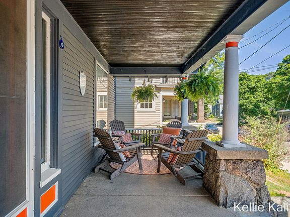 Get ready for prime summer porch-sitting and memory making in this historic Heritage Hill home perched above street level. A large foyer welcomes and leads to a formal dining room with coffered ceilings. 5 bedrooms (1 non-conforming). The spacious 3rd floor primary suite delivers a treetop retreat, ample storage, space for a king bed, plus a reading or yoga nook. On the 2nd floor, step outside the bonus room / library to enjoy coffee on the private balcony, the only one grandfathered in for use on the street. 3.5 bathrooms; the 2nd floor showcases a historic claw-foot bathtub. Grill on the terraced back patio, or unwind under the wisteria that hang above the inlaid pavers in the terraced garden with historic inlaid stone shuffle board. The furnace, water heater, and stove were replaced in 2024. Enjoy the bonus of a partially finished basement - a unique feature in this historic neighborhood - ideal for extra work, living, or play space. Plaster repairs were completed throughout the home in 2025. Home and garage exteriors were painted in 2023. Philips Hue smart light system throughout the home. New driveway and retaining walls (along the driveway and in the front yard) were added in 2023 at a cost of close to $40,000. The carriage house has been converted into a 2-stall garage. 2.5 blocks east of Pleasant Park. 1.8 miles to downtown Grand Rapids. 2 blocks south of the shops, restaurants, & businesses along the Wealthy Street Corridor. This beauty is ready for living and hosting.