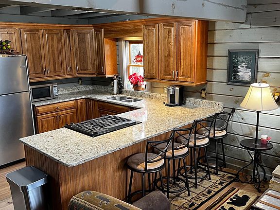 Recently remodeled, the cabin is loaded with rustic charm--wood beam ceilings, 2 covered porches, and a tin roof. Yet it has all the modern conveniences, including beautiful hardwood floors, maple cabinets, new granite countertops, a gas log fireplace, and tankless water heater. Just bring your clothing, as the cabin includes all furnishings.