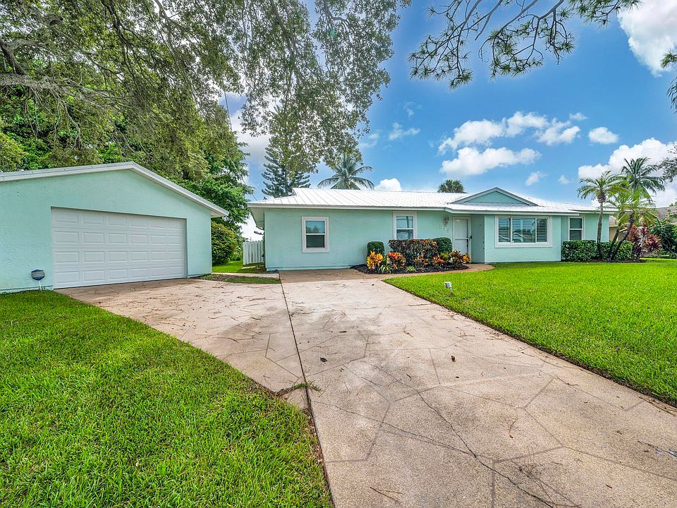Welcome to your dream oasis on a 1/3-acre lot with stunning long water views of the C24 canal. Enjoy breathtaking sunsets and fish right from your private dock, rebuilt in 2020. The fully permitted garage is now a versatile space perfect as a den, office, or 4th bedroom, complete with built-in bookshelves and walk-in closets. A separate 1.5-car garage with a workbench and storage is ideal for projects. Recent updates include a 2022 metal roof, 2019 kitchen/bath remodel, 2023 floors, 2019 impact windows/doors, a whole-house generator (2022), and hurricane protection throughout. Hurricane protection is a breeze with roll-down shutters securing the A/C Florida room, giving you peace of mind during storm season.Don't miss this exceptional waterfront gem!