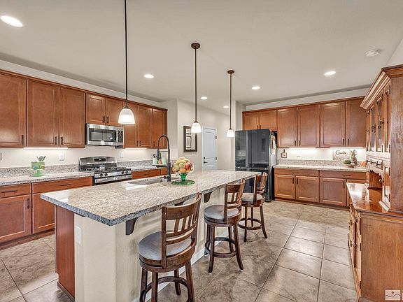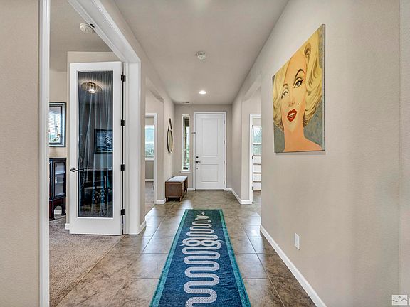 Welcome to this stunning, like-new home nestled on the Dayton Valley Golf Course! Located on a spacious 0.57-acre lot at the end of a quiet cul-de-sac, this beautifully upgraded Silverado home offers incredible 180-degree views of three golf course ponds and the surrounding Virginia Range and Pine Nut Mountains. Inside, you'll enjoy an open-concept floor plan with 3 bedrooms, plus a den/office, making it the perfect blend of functionality and comfort. The cozy gas fireplace in the living area adds a touch, of warmth, while the oversized granite kitchen island, pendant lighting, and large pantry provide plenty of space for cooking and entertaining. This home is packed with upgrades, including custom cabinets, oil-rubbed hardware, a farmhouse sink, under-cabinet lighting, and a laundry room with extra cabinets and a sink. For the green thumb, there's plenty of space for gardening with fruit trees, garden boxes, and a greenhouse. The yard is well-maintained with low-maintenance landscaping, pavers, and drip irrigation in both the front and back.