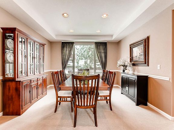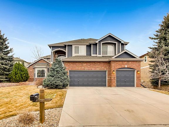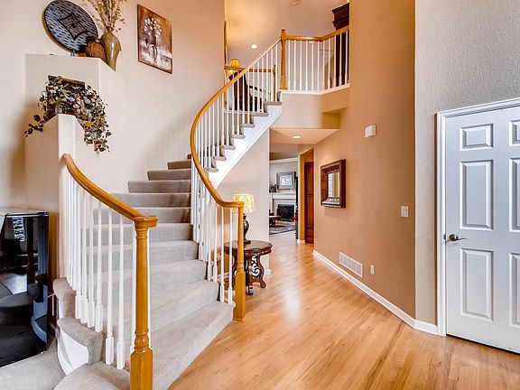 NEW Price! Stunning entry with curved staircase, vaulted entry and living room, plantation shutters, large formal dining room. Large gourmet kitchen with 42" cabinets, slab granite, double oven, SS refrigerator, cooktop, new dishwasher, built-in desk, eating area. 2-story family room with a cozy gas fireplace, built-in media cabinets, hall closet, laundry. Main floor study/6th bedroom with french doors, full bathroom. Upstairs features a master bedroom with dual doors, coffered ceilings, bay window sitting area, 5-piece master bathroom, tile floors, dual walk-in closets, 3 additional bedrooms and 2 bathrooms upstairs. Professionally finished basement-theater room, speakers, bar area, flex space, bedroom, full bathroom. Large back patio, mature landscaping, fencing. ADT Pulse Smart Home upgrade - remotely control lights/outlets/switches, cameras, thermostats & front door lock. Wonderful neighborhood, walking trails, views. Timber Trail Elementary, Rocky Heights Middle, Rock Canyon High.