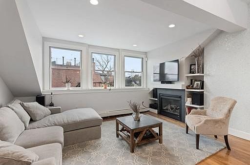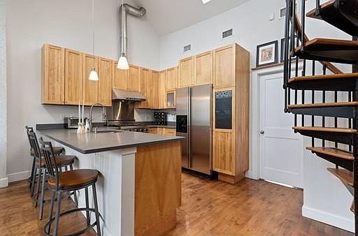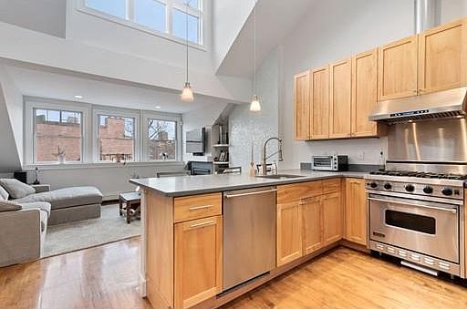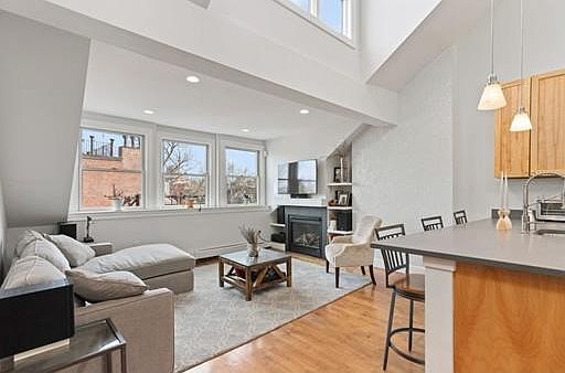 Dramatic 2+ bedroom/1 bath penthouse in the heart of the South End offers wide open living space plus bonus loft that overlooks the living area. Wonderful living room with soaring ceilings, skylights and recessed lighting. Gleaming granite kitchen has stainless steel appliances and convenient breakfast bar. Two bedrooms with ample closet space and full bath with marble vanity. Upstairs is a sleeping loft with door to fabulous roof deck with panoramic views.