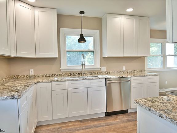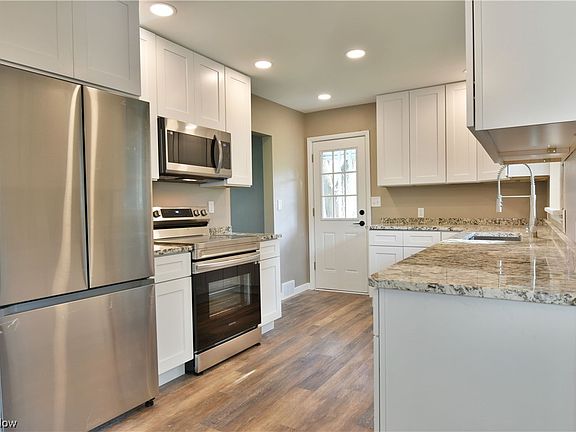 Masterfully updated from top to bottom, this expansive Cortland split level brings fantastic looks both inside and out! The impressive property offers tons of natural privacy with its scenic, tree lined lot that’s best enjoyed from either the full walk out basement or the expansive second floor deckspace. An attached two car garage tucks away underneath while the formal entry way reveals a decorative door that spills plenty of natural light into the main stairway entrance. At the main floor, the window lined great room steals the show as sunshine floods the hardwood styled flooring, spilling into the dining portion. Opposite, a substantial kitchen includes both casual, eat-in dining space and luxurious granite countertops with updated cabinetry and appliances. A direct side entry walkout is also available. Down the main hall, the three welcoming bedrooms are joined by a charismatic bath with its elegant tile work. The larger master suite includes its own private half bath to complete the floor. Down below, the spacious family room enjoys plush carpets that continue into the fourth bedroom and unique bar area with its serving window. A second full bath and laundry services round things out. Updates included: Roof - 2017, Furnace - 2015, Windows - new vinvly replacements in 2021, AC - 2015, Basement was waterproofed by Ohio State Waterproofing in 2017. See home update sheet in supplements.