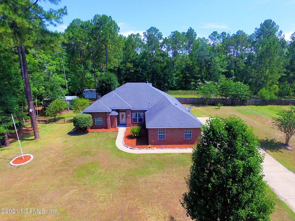Wow! will be your first words when you walk through the door to this home. This 4/2 brick beauty sits on 1.5 acres on a very private lot, it is one of the few houses in the community that is not subject to the HOA. Great floor plan with split bedrooms, beautiful wood tile throughout. Large primary bedroom and bathroom, Bedroom has French doors that open up to the Florida room to give it that indoor/outdoor feel. Owners bathroom has large garden tub, stand up shower ,walk in closets and double vanity sinks that offer plenty of room for 2 people to get ready. Kitchen is light and bright w plenty of counterspace, lots of cabinets, and stainless steel appliances. Vaulted ceilings, wood burning fireplace, 2 car side garage , very long driveway, enough to fit plenty of cars or a boat or an RV. Water softener system with an extra Osmosis system to make your water taste extra clean. Huge screened lanai out back ,outdoor shower, 2 large sheds, and plenty of room for a pool. Seller often sees deer and other wildlife while sitting out back enjoying her coffee. Four Creek preserve is 1/2 mile away, offers kayaking and camping and all year fun! Close to Jacksonville but still far enough away to offer a country feel but still separated from the hustle and bustle of the city, not to mention Nassau county's excellent schools, this home will not disappoint!
