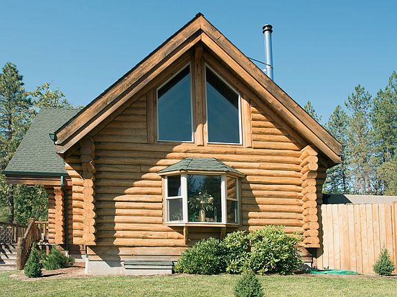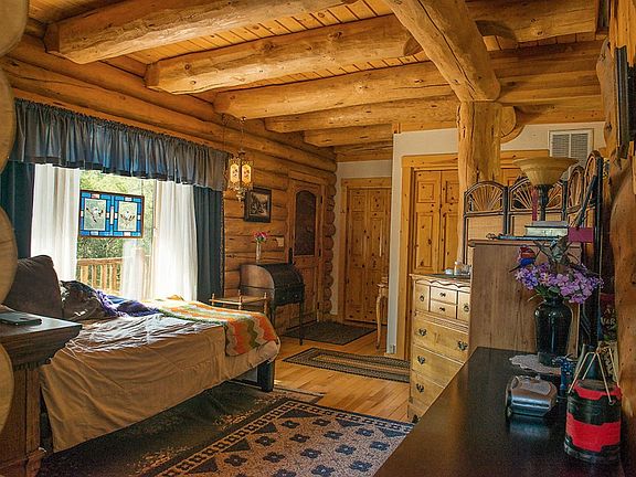 This beautiful 2BR,2BA Custom Log home built from 10"round Swedish-coped Oregon cedar features hickory flooring, vaulted ceilings, an open floor plan with a bedroom and full bath on each floor, a large family room and certified wood stove; gorgeous mountain views from your decks on both upper & lower levels. Lower deck could be extended for a Master Suite addition on main floor; 3 BR septic is already installed. Home is wired for 400 Amp service. Log homes are wonderfully efficient, keeping warmer in the winter and cooler in the summer than traditional homes.This wonderful home and property show pride of ownership. Extensive landscaping in both front and back yards, a small shop, greenhouse and fenced garden, and a ground-level trampoline. A 14'x24' Studio with attached 2-car Garage and Carport completes this package. Ideal horse property. Peaceful and private, 5 acres of mostly flat, useable land. This home is a must see; your perfect woodland sanctuary!