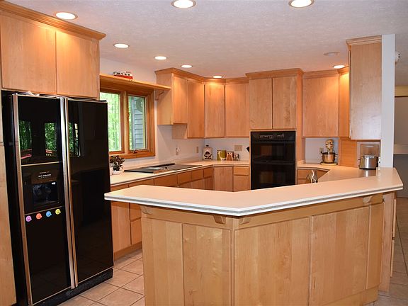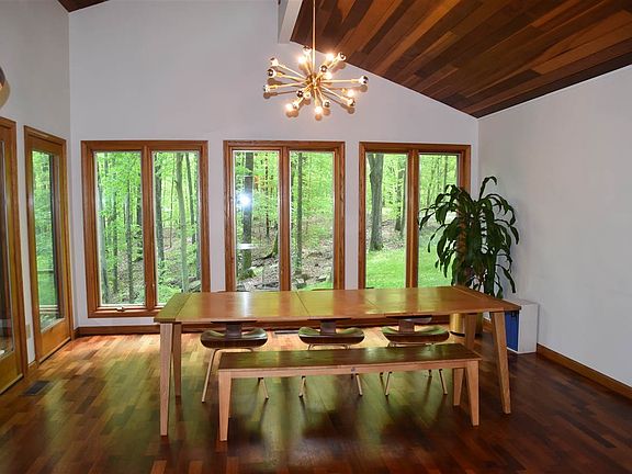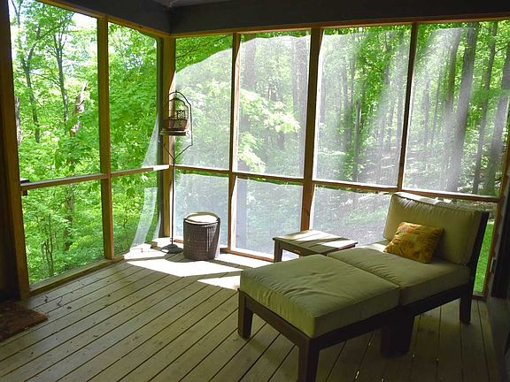 Stunning 4-bedroom contemporary home offers fabulous features and a majestical wooded setting in Kingston Estates. Property is a stone's throw from state forest and hiking trails. It is only minutes to IU Campus, shopping and downtown Bloomington. Sellers have loved nature walks and the fact that they are so close to everything, yet in a virtual paradise. The home was built by Larry Baker, a name synonymous with quality. It features custom kitchen cabinetry by Larry Ferree including pantry w/pull-outs, built-in appliances--convection wall oven & microwave, smooth cooktop w/Dacor downdraft plus JennAir Grill. The dining room has hardwood floor and expansive Pella windows that allow one to partake of the wooded views. There is a gorgeous stone wood-burning fireplace w/built-in wood compartment and mantels to display favored pictures or artwork. The Sellers had a custom built-in bookcase by Larry Ferree that soars to meet the vaulted ceiling and a rolling ladder to easily access all areas with ease. The living and dining rooms boast hardwood ceiling. There is a large deck off of the living room and a screened porch off of the dining area that are connected for ease in entertaining. There is an additional deck off of the master suite that the wood was just replaced. Ascend just a few steps to the upper level that offers two large walk-ins for storage or multi-use. The master suite has it own bath plus generous walk-in closet. There are two more bedrooms plus a 2nd full bath on this level. There is a 4th bedroom with room for a sitting area and its generous window brings nature inside. The lower level offers a family or recreation room with numerous closets--storage galore found here. The laundry area has a door to the exterior. There is a combination utility room/workshop on the lower level. Buyers will appreciate the attached 2-car garage plus an oversized 2-car detached garage that is perfect for a workshop or boat/water toys. Updates since Sellers purchased the home: Dimensional roof shingles & new gutters on home & detached garage (2017); new carpeting in living room and bedrooms (2017); exterior of home stained; interior of home painted (within 3 years to present); Added stunning custom built-in bookcase and ladder by Larry Ferree; Driveway--asphalt-- small area left as graveled; added pocket lights in Master Bedroom and lights in all upstairs bedrooms; Added riser/lid to septic.