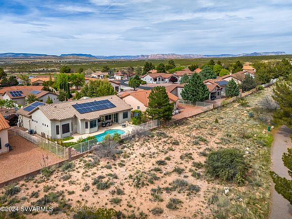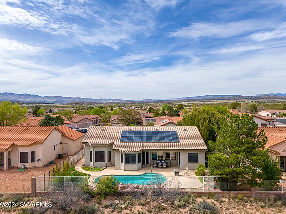 Splash into summer with a private heated pool, mature landscaping for privacy & golf course views. This flexible floor plan has a spacious great room w built in entertainment center & kitchen w walk in pantry, corian counters, reverse osmosis and breakfast nook. The flex room, which could be your office; 3rd bedroom or den, has access to the front courtyard w privacy wall and views of Mingus Mountain as well as the sparkling lights of Jerome. Extra storage cabinets in garage, built in cabinetry in baths, & laundry room. Private backyard is fenced & has a pool w waterfall and golf course views. Bay windows in breakfast nook, dining room, living room & primary suite. Sculptured marble vanities in bathrooms, jetted tub in primary - all of this PLUS owned solar. Come see for yourself!